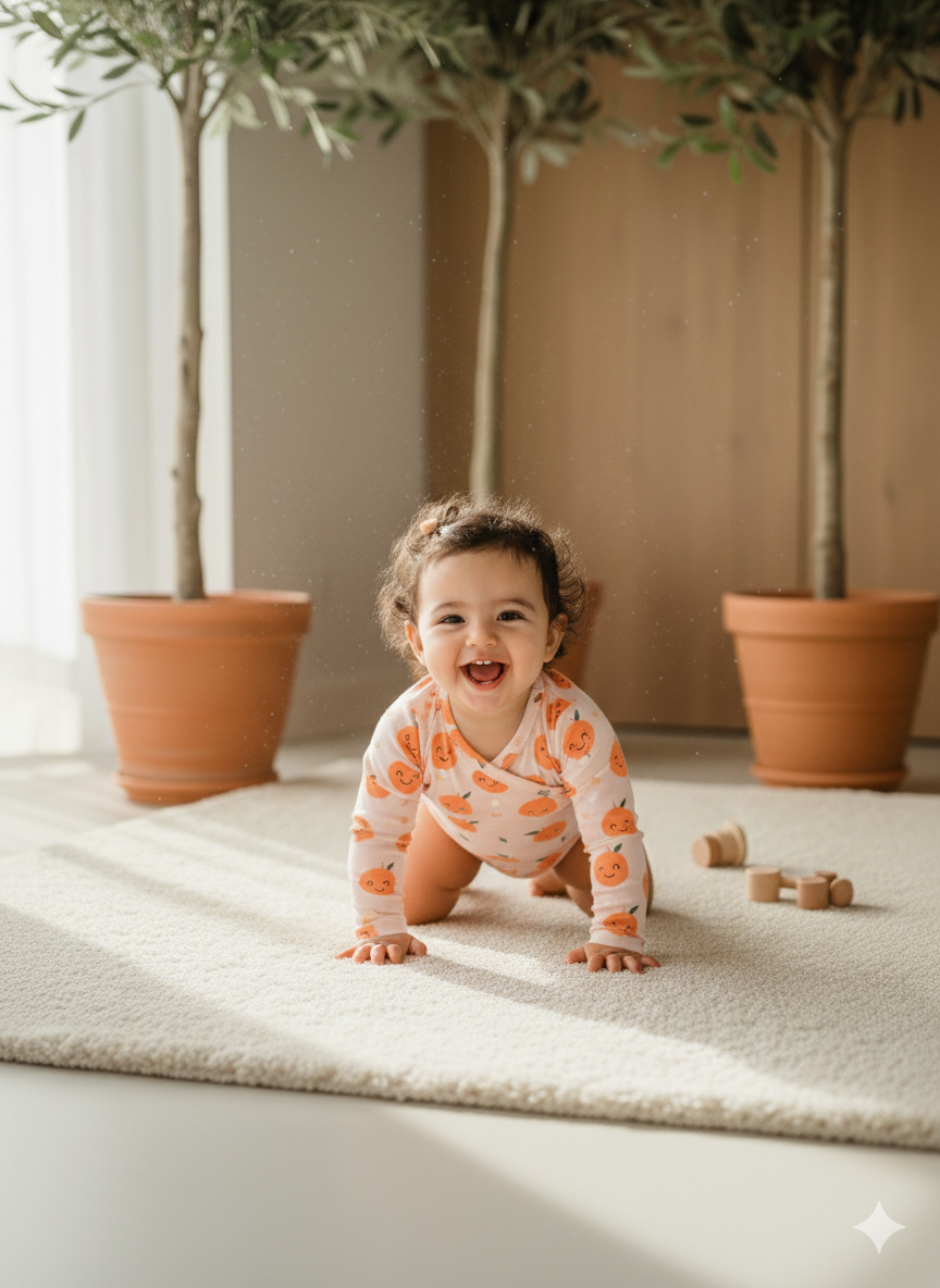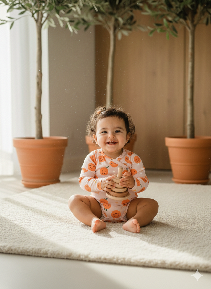 Wzór z pomarańczą został zaprojektowany specjalnie dla nas przez polską projektantkę. Nasze ubranka są szyte w lokalnej szwalni z wysokiej jakości materiałów. Używamy dzianin, które posiadają certyfikat Oeko-Tex Standard 100. Wysoka gramatura materiału oraz jego skład (bawełna z elastanem) sprawiają, że ciuszki są niezwykle mięciutkie w dotyku.